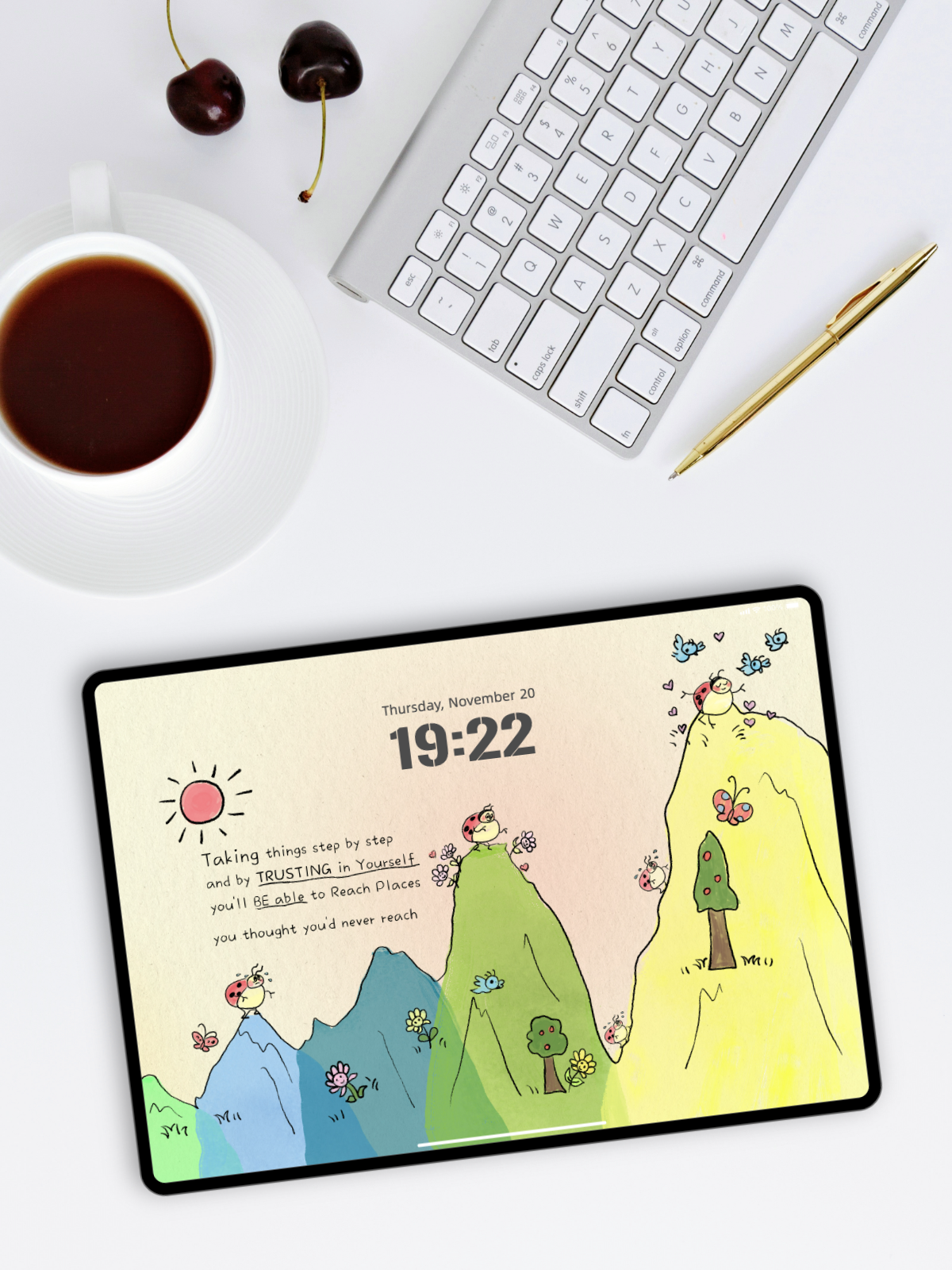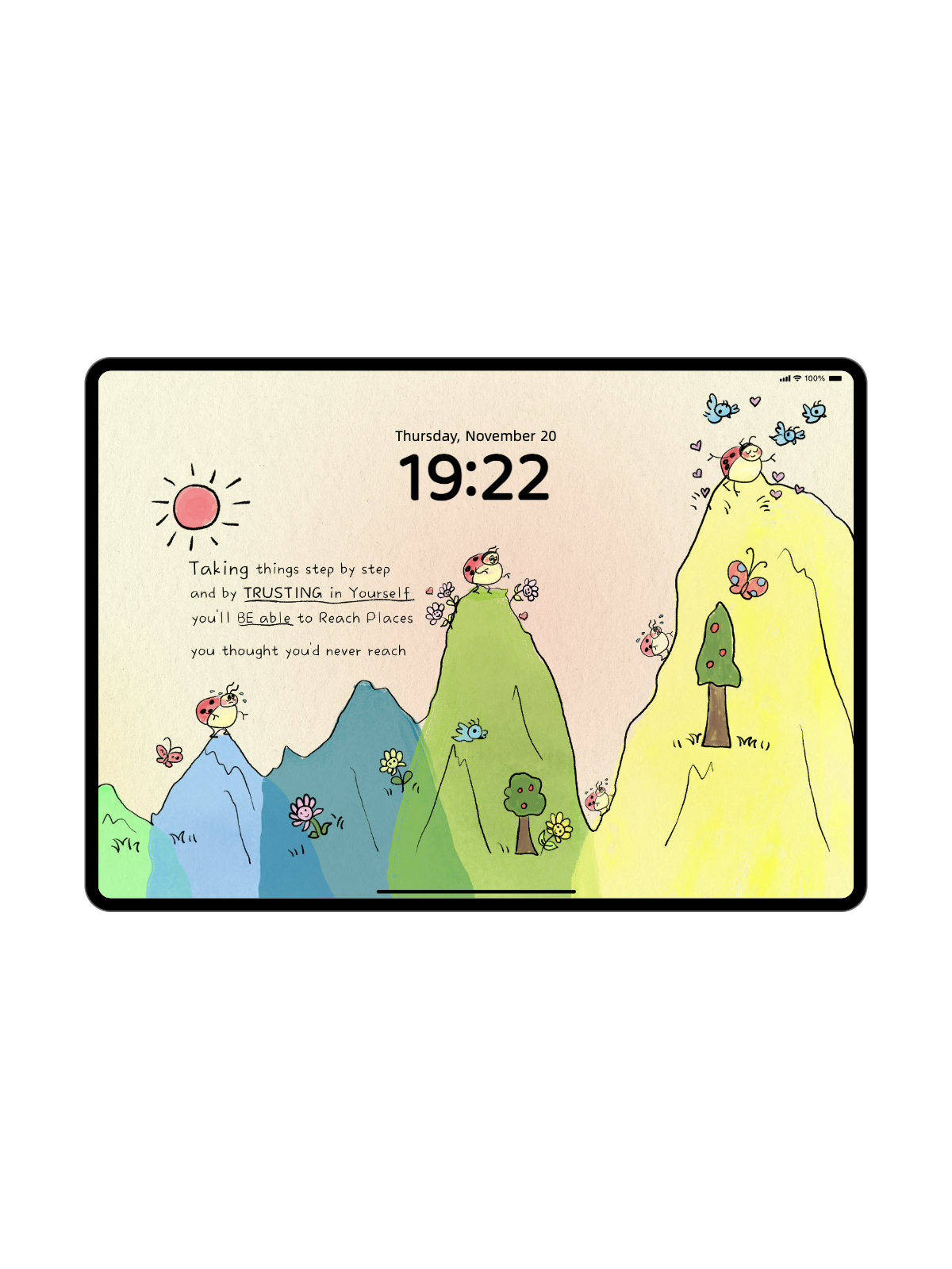A whimsical hand - drawn scene where ladybugs climb pastel - colored mountains under a sunny sky. With an inspiring quote—“Taking things step by step...you’ll reach places you never thought possible”—it blends cute illustration and motivational charm. Perfect for adding a dose of positivity and playful art to your iPad, turning every unlock into a mini adventure. Let these cheerful bugs and vibrant hills brighten your daily tech view!